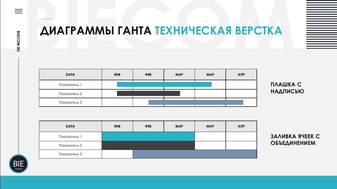 Как технически оформить диаграмму Ганта в презентации? Полосы можно создать двумя способами: