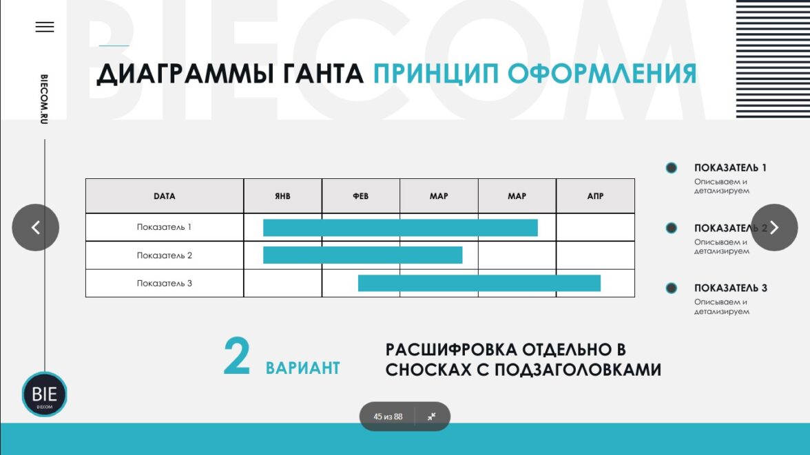 Этот тип диаграмм состоит из полос, ориентированных вдоль оси времени. Каждая полоса на диаграмме представляет собой отдельную задачу в составе проекта, ее протяженность — длительность работы. По вертикальной оси обычно обозначают перечень задач.Диаграмму Ганта используют в специальных приложениях по управлению проектами, таких как Kaiten, Planfix, Week. В презентации PowerPoint она будет размещена в усеченном формате, например, чтобы познакомить команду с проектом или рассказать о промежуточных результатах.Как правильно оформить диаграмму Ганта в презентации? На нее распространяются те же правила оформления, что и на обычную таблицу. О ней мы подробно рассказывали в предыдущем материале.