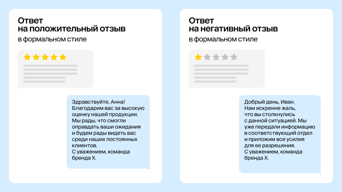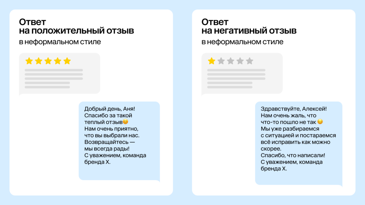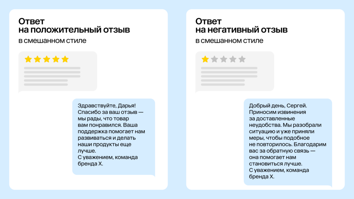 Важно помнить: неформальный стиль может быть неуместен, когда отзыв сообщает о серьезной проблеме. В этом случае лучше ответить в смешанном или формальном тоне.