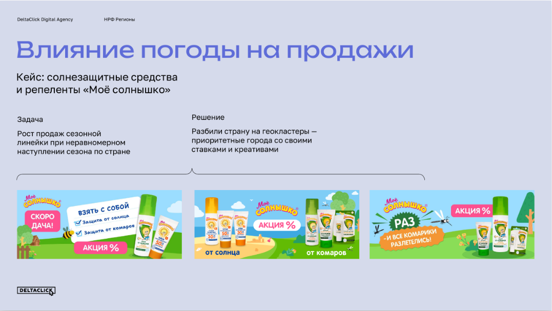 На примере «Мое солнышко»: география делится на кластеры, запускается погодный таргетинг и сезонные показы по регионам: сначала юг, затем Урал, с дополнением карточек и медийной рекламы по городам. В итоге общая выручка выросла на 15%.