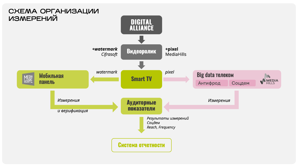 Применение технологии Audio Watermarking позволяет заранее маркировать рекламные креативы на стороне селлера для выявления источника его трансляции в дальнейшем. Сбор данных о взаимодействии с рекламным сообщением осуществляется программным комплексом Cifrasoft и Mediascope с помощью мобильных устройств панелистов. Для фиксации звуковых меток сформирована мобильная панель Mediascope, которая включает десятки тысяч респондентов по всей стране. Данные с мобильной панели обрабатываются ежедневно. Одновременно с размещением рекламных роликов интегрируются пиксели MediaHills, которые позволяют отслеживать взаимодействия с рекламой на уровне домохозяйства. Данная информация становится доступной благодаря партнерам — телеком-операторам, которые анализируют трафик и фиксируют срабатывание пикселя на своих абонентах. После анализа больших данных, предоставляемых телеком-операторами (потребляемый контент через традиционное телевидение, ОТТ и пиксели в рекламных роликах), формируется отчет о контактах с рекламой.
