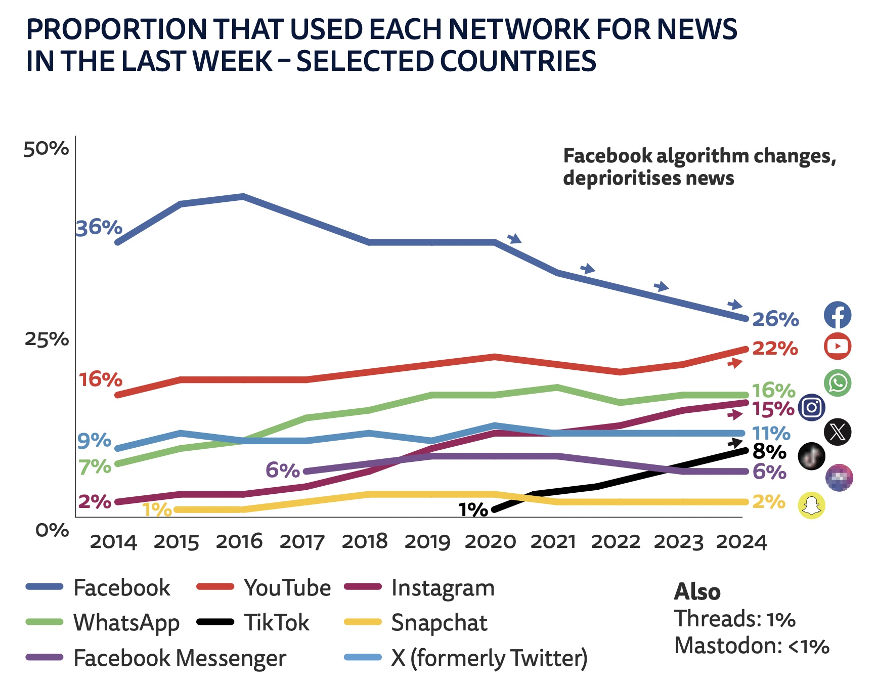 Facebook скоро может потерять звание самого популярного источника новостей среди соцсетей. 10 лет назад, в ходе аналогичного исследования, 36% опрошенных заявляли, что использовали эту соцсеть для чтения в течение последней недели. В последующие годы этот показатель поднимался выше 40%, но в 2020 году был изменен алгоритм соцсети, приоритет новостей в выдаче был снижен. С того времени популярность Facebook как новостного источника стала уверенно снижаться. В свежем исследовании показатель составляет 26%. Это еще первое место, но у других социальных платформ показатели, наоборот, уверенно растут.