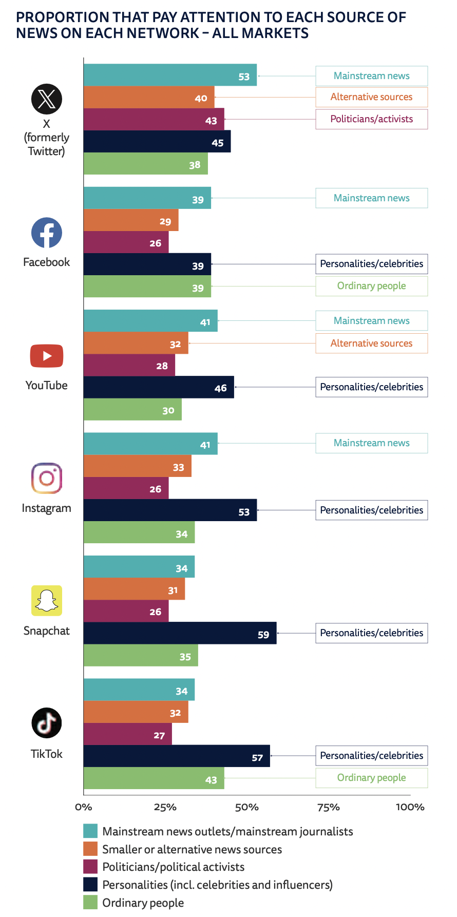 В Х правит бал мейнстрим (53% пользователей предпочитают данный источник информации). Пользователи Facebook одинаково ценят мейнстрим, инфлюенсеров и новости, полученные от знакомых (по 39% для каждого источника). В YouTube, Instagram, Snapchat и TikTok самым популярным источником новостей являются инфлюенсеры (46%, 53%, 59% и 57%).
