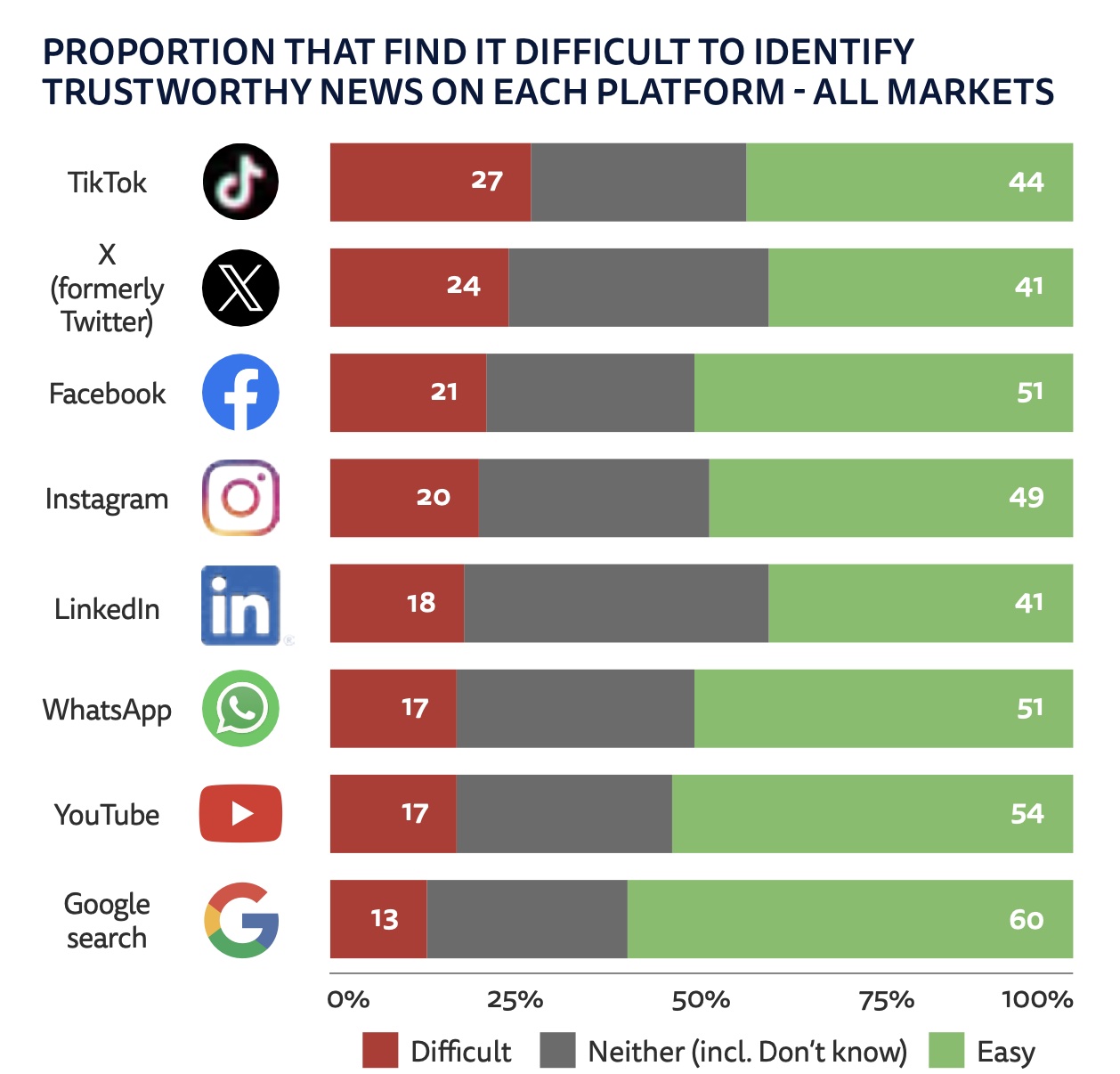 Пользователи признаются, что им сложнее всего отличить фейк от правды в TikTok (27%), Х (24%), Facebook (21%).