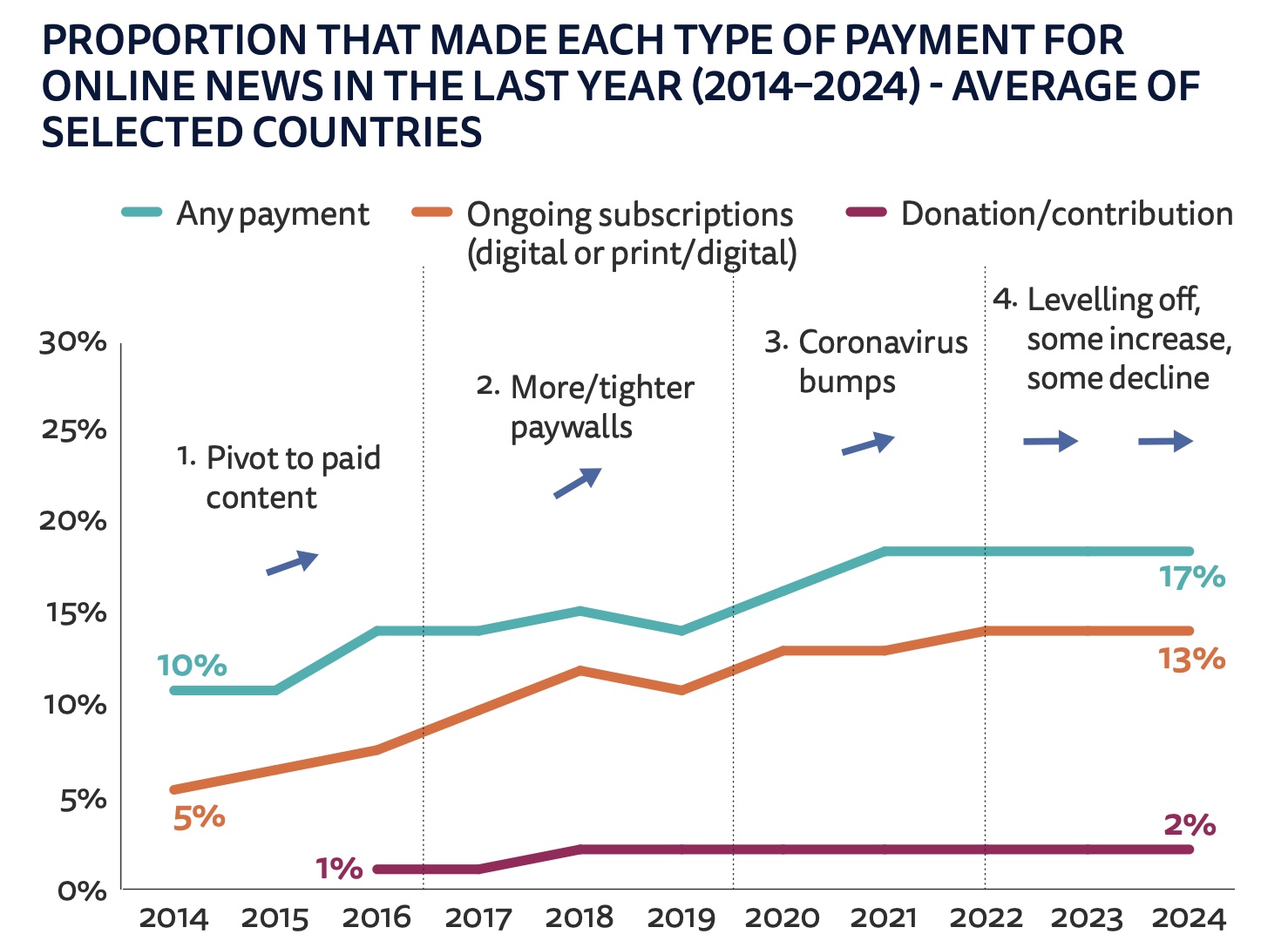 Соцсети все больше перетягивают к себе читателей, что негативно отражается на финансовом положении традиционных новостных структур. СМИ разных стран, сталкиваясь со снижением рекламных доходов, пытаются исправить ситуацию с помощью платных подписок и призывов к читателям делать добровольные пожертвования. Но, как видно из Digital News Report, платная модель новостей приживается далеко не везде, а число желающих платить практически не растет.
