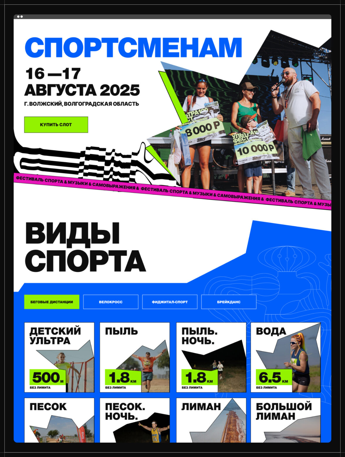 Потом привел нам крупнейший мультиформатный фестиваль России — ULTRA100. На сайте устарел дизайн, и хромала конверсия. Наша задача была: обновить дизайн сайта для фестиваля, и показать всю экосистему ULTRA100. Этот проект принес нам 3 место на Workspace Digital Awards в категории «развлечения, спорт, туризм», подробнее о нем можно почитать в кейсе.