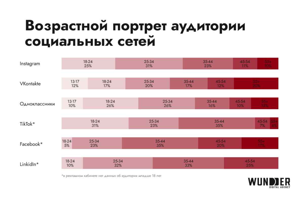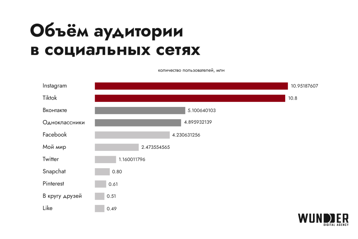 Наибольший объем аудитории — у Instagram* (10,9 млн) и TikTok (10,8 млн). Вдвое меньше пользователей у «ВКонтакте» и «Одноклассников» (5 и 4,9 млн, соответственно). У следующей по популярности сети Facebook* аудитория составляет 4,2 млн.