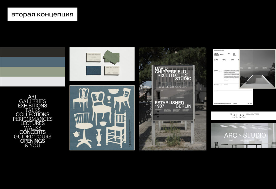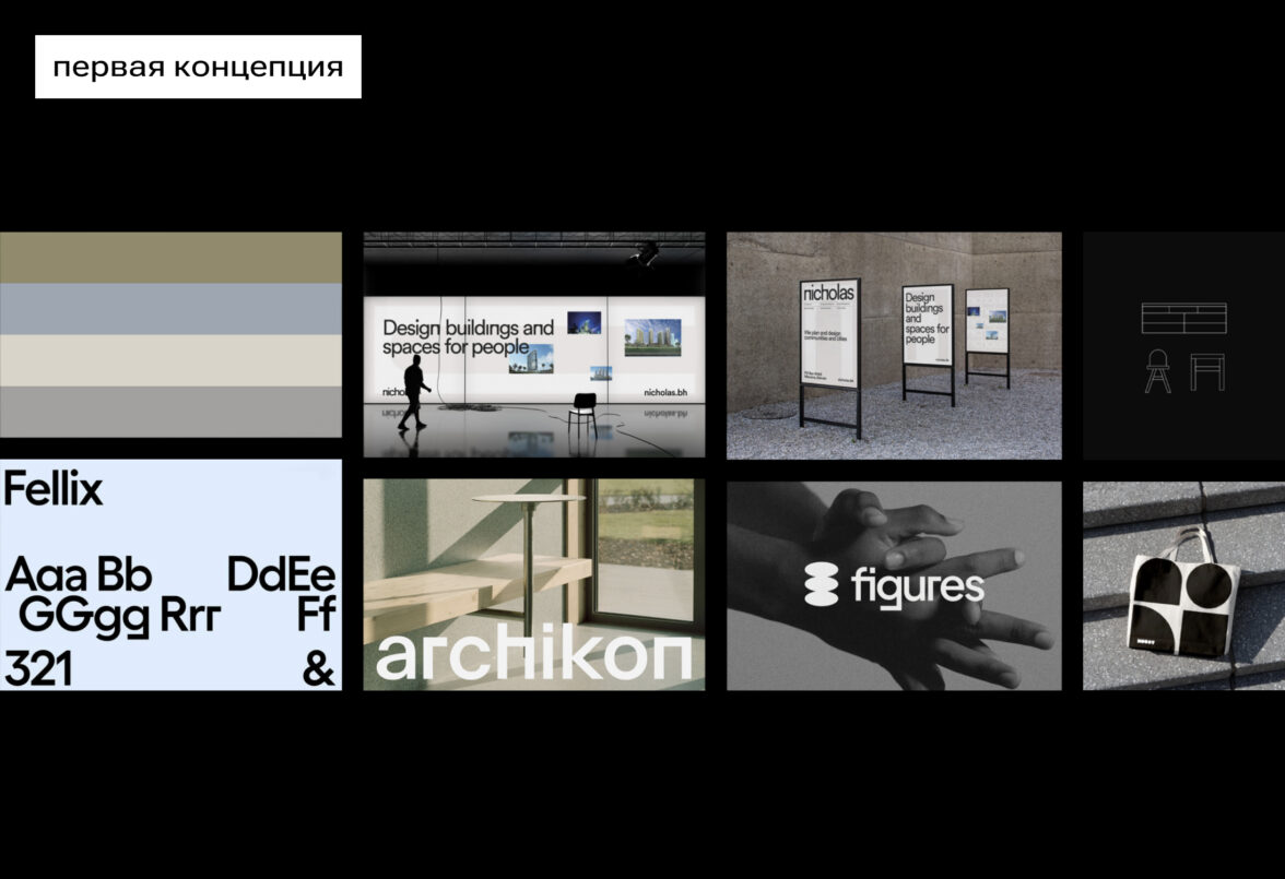 Первая концепция передаёт ощущение порядка и прозрачности за счёт мягкого света, простых форм, аккуратной типографики и обилия свободного пространства. Айдентика остаётся динамичной за счёт гибкой палитры и модульной графики — лаконичных линейных иллюстраций и иконок из простых геометричных форм. В её основе — брутализм и строгая геометрия, которые для архитектурной компании становятся чёткой и прямолинейной метафорой профессионального подхода.
