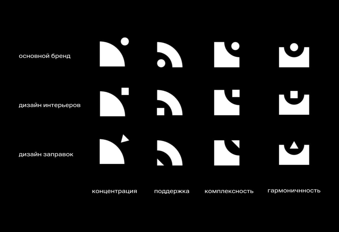 Цветовая палитра усиливает индивидуальность направлений: коричневая гамма — для интерьеров, контрастный жёлтый — для заправок. Визуальная система дополнена линейными иллюстрациями и иконками на основе логотипной геометрии. Они масштабируемы, легко адаптируются под любые носители и подходят для анимации.