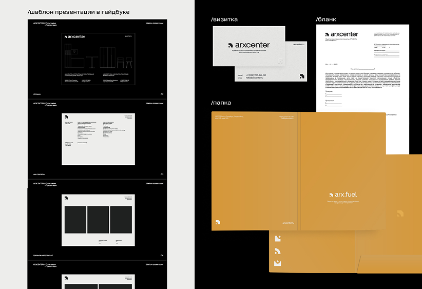Arx.fuel, ориентированный на заправочные станции, использует динамичную палитру с жёлтым и чёрным — символами энергии, движения и технологичности. Суббренды сохраняют связь с ARXCENTER, оставаясь при этом уникальными и понятными для своей аудитории.