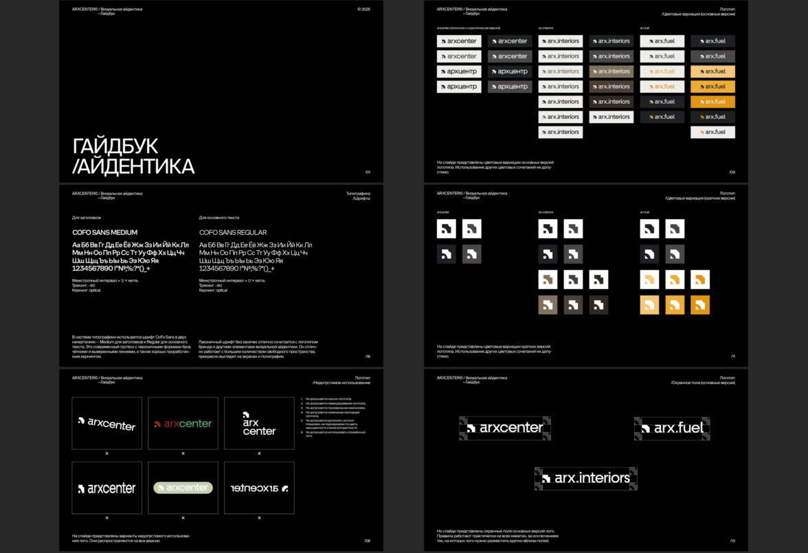 В нем собраны основные, краткие, шрифтовые и кириллические версии логотипа, описаны охранные поля, цветовые вариации и недопустимые приёмы. Каждое направление — основной бренд, arx.interiors и arx.fuel — имеет собственную цветовую палитру, подчёркивающую характер деятельности, но сохраняющую связь с общей системой.