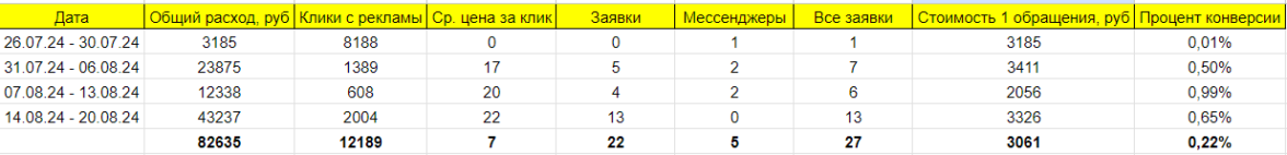 По итогам тестирования, получили 37 лидов по 2233 рубля. Исходя из качества лидов, было 27 целевых заявок по 3061 рубль. Стоимость обращения дорогая. Но текущая статистика по лидам была неполная, так как дополнительно зафиксировалось 23 перехода в мессенджер. «На словах», из них было 5 целевых обращений. А с каких именно рекламных кампаний и ключевых фраз, мы не видели.
