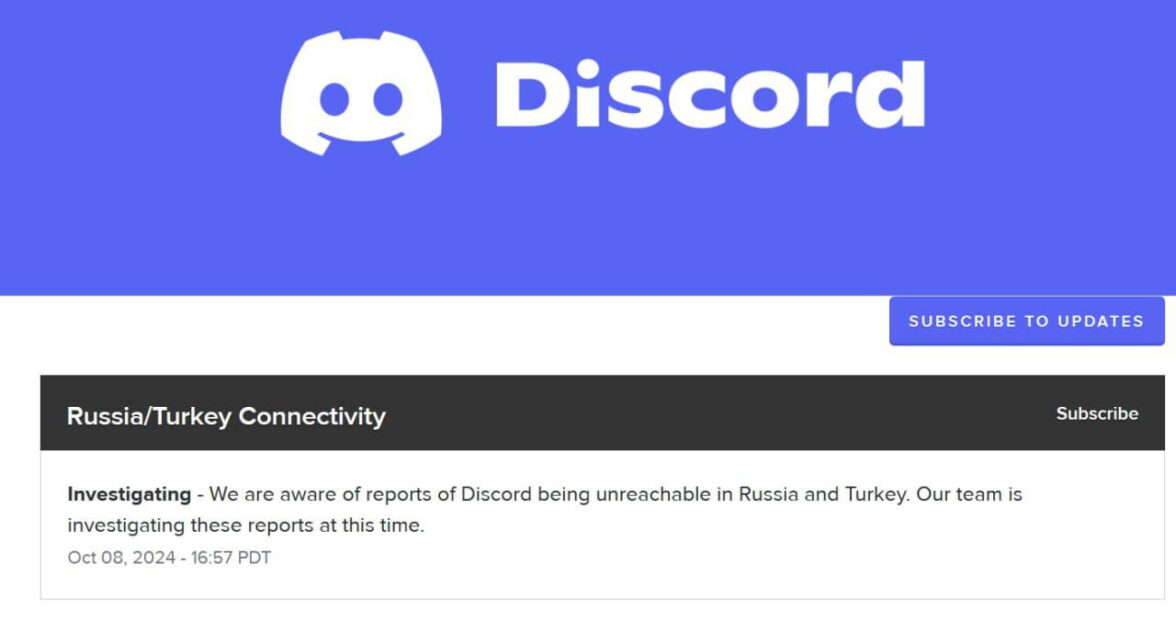 Мессенджер Discord был заблокирован в России 8 октября 2024 года. В своем комментарии ТАСС пресс-служба РКН сообщила, что «доступ к мессенджеру Discord ограничен в связи с нарушением требований российского законодательства, выполнение которых необходимо для предотвращения использования мессенджера в террористических и экстремистских целях, вербовки граждан для их совершения, продажи наркотиков, в связи с размещением противоправной информации». При этом на сайте РКН в разделе «Новости» никакой дополнительной информации нет.