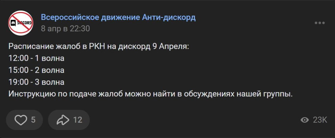 «Можно вздохнуть с облегчением. На протяжении более чем 6 лет мы добивались блокировки дискорда и скидывали доказательства ужасов которые там творятся в РКН. Наконец этот день настал.Это последний пост группы. Мы победили! Россия победила!» — радостно финализирует свою деятельность группа численностью 1007 человек и лозунгом «Заблокируй дискорд спаси детей!».