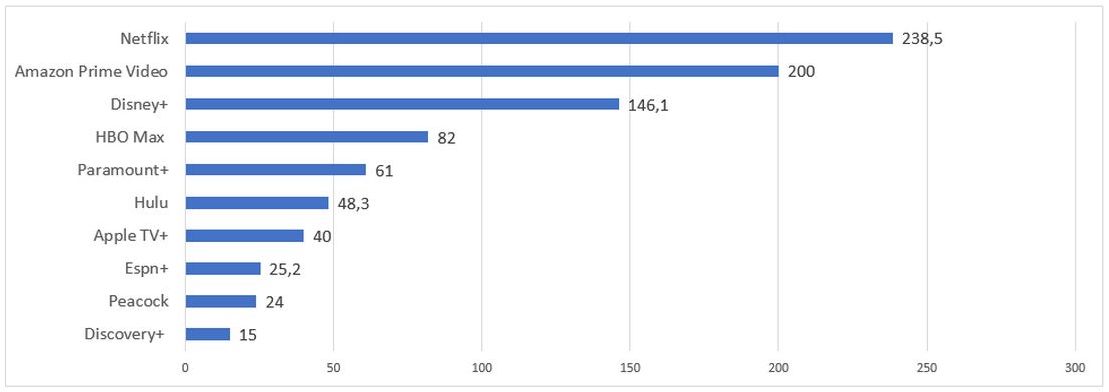 Если в прошлом году все видеосервисы Disney в совокупности опережали главного конкурента — Netflix — по количеству подписчиков, то сейчас у них в совокупности 219,6 млн абонентов, а у Netflix — 238,5 млн.