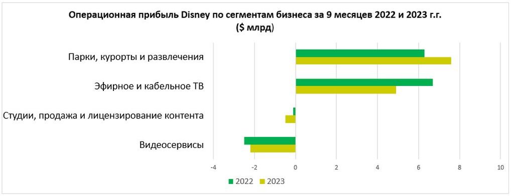 Из всех подразделений Disney сейчас приносят прибыль лишь парки и развлечения, а также ТВ-каналы (Disney Media). Продукция студий и видеосервисы убыточны.
