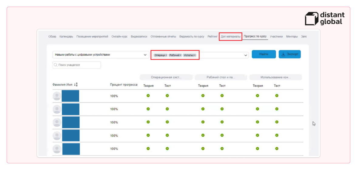 Данные статистики Distant Global можно группировать по любым параметрам. Например, по всему потоку и по каждому слушателю отдельно, выявлять отстающих и загружать на платформу дополнительные обучающие материалы им в помощь (имена слушателей скрыли)