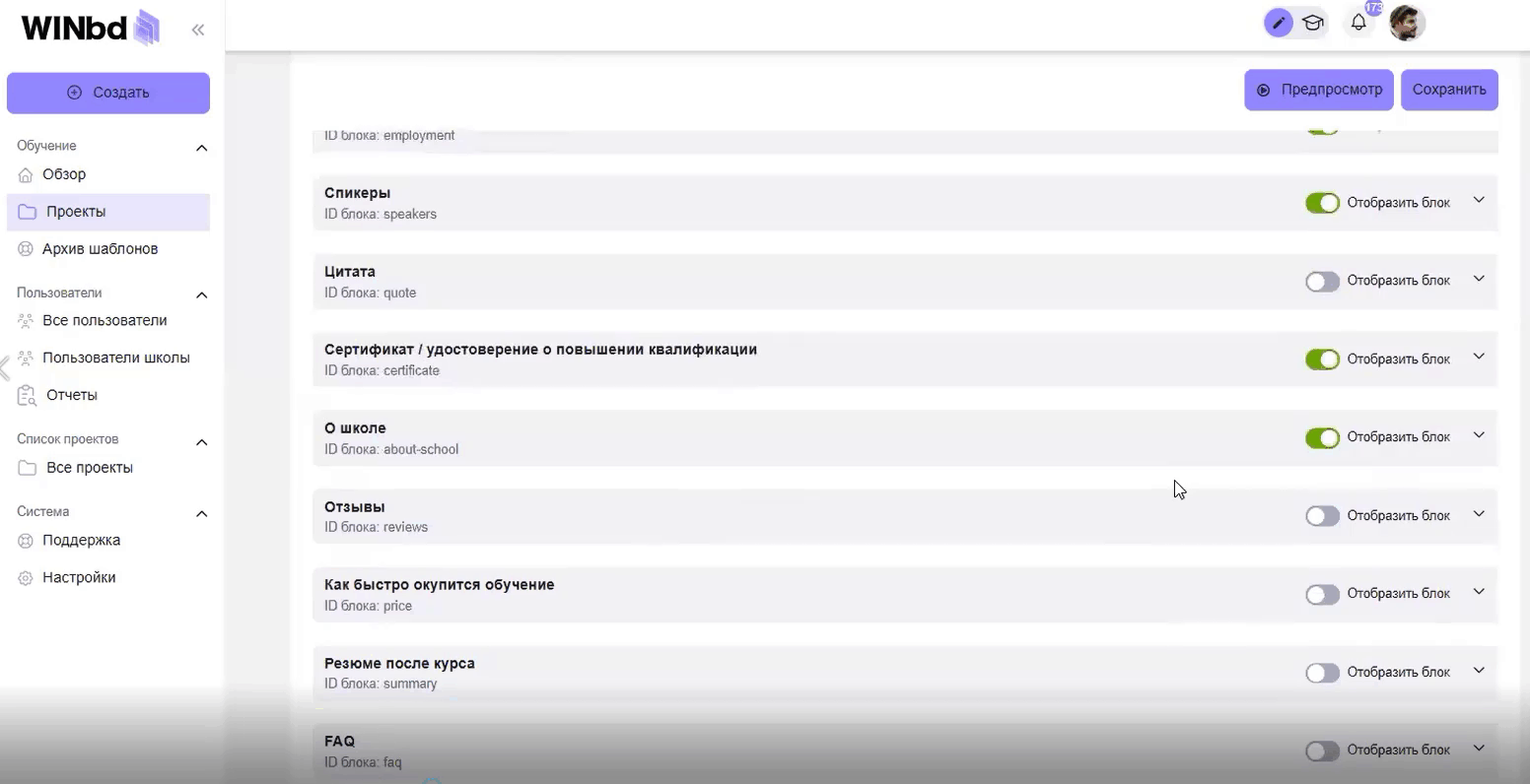 Выберите тип проекта и задайте основные настройки: количество слушателей, дату проведения и так далее (показали на примере онлайн-школы WINbd)