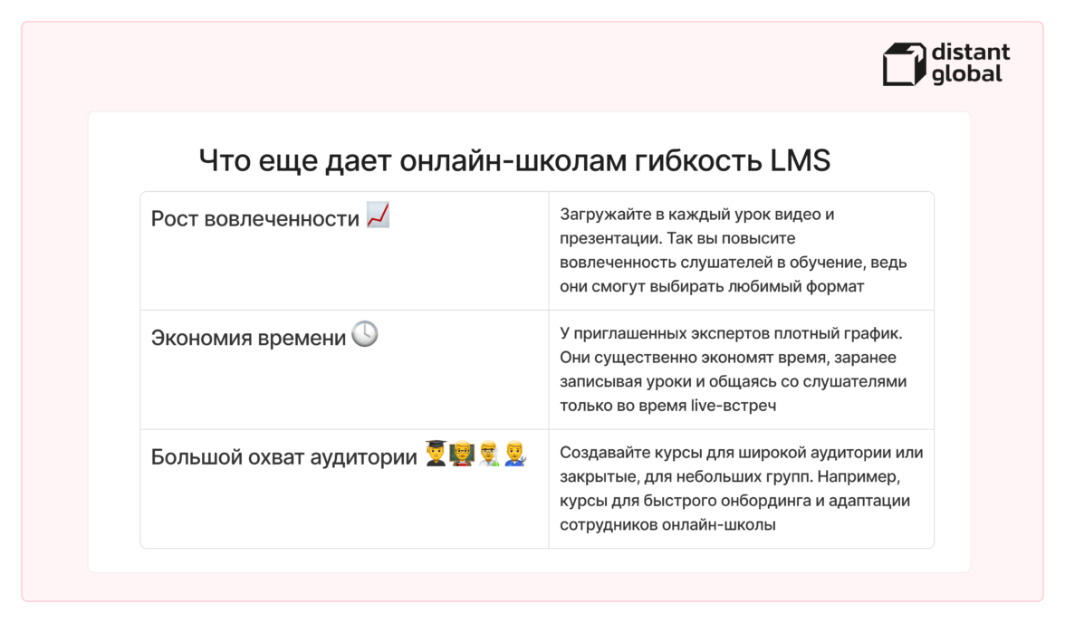 Благодаря гибким настройкам, на платформе Distant Global можно применять современные методики обучения. С их помощью легко найти индивидуальный подход к каждому слушателю и создать благоприятную атмосферу для обучения. Все это основные принципы персонализированного подхода, который сейчас применяется повсеместно. На Distant Global вы также можете адаптировать программу под запросы слушателей, оценивать их прогресс и положительно влиять на динамику обучения.