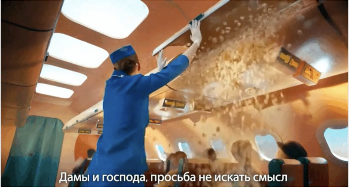 Например, в рекламном ролике от Авиасейлс с верхней полки самолета сыплется попкорн, но закадровый голос призывает не задумываться о смысле, а искать дешевые билеты в приложении компании.