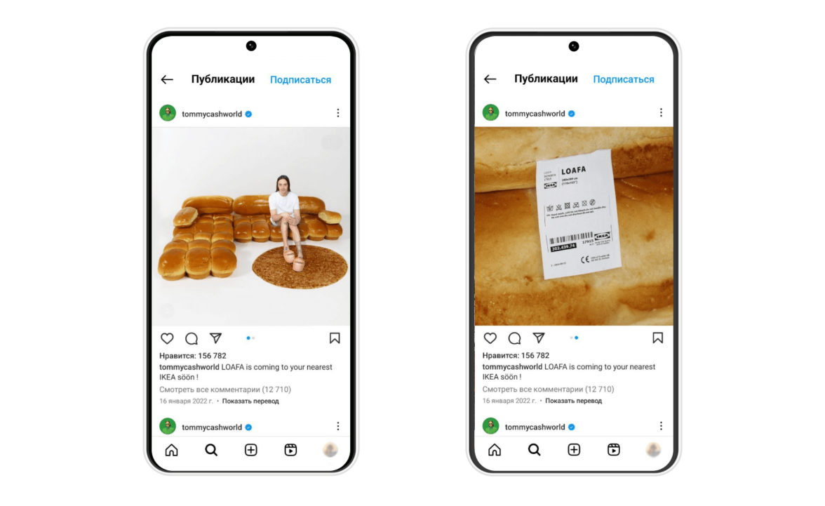 В 2022 году эстонский рэпер Томми Кэш выложил в Инстаграме* фотографию, где он сидит на диване в виде буханок хлеба. Артист написал, что IKEA обещает выпустить такой дизайн, если пользователи оставят под постом 10 000 комментариев.