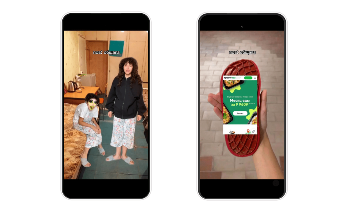 Некоторые бренды специально стилизуют контент под треш-рекламу 2000-х годов или утрируют ситуации, которые происходят в креативах. Например, сервис доставки готового питания «Просто Еда» выпустил ролик, где студенты заказывают их продукты в общагу.
