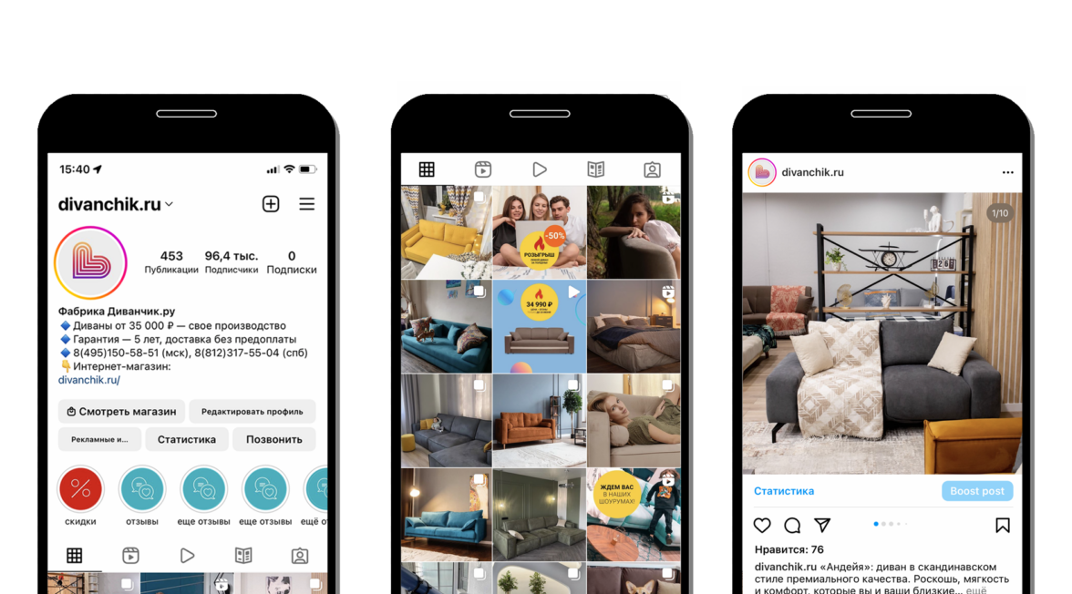 Диванчик.ру — беcкомпромиссные продажи мебели через Instagram*: 460% ROMI, +95к подписчиков