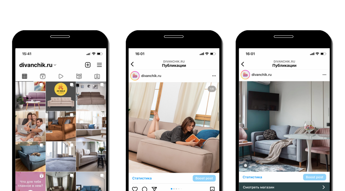 Аккаунт фабрики «Диванчик.ру» в Instagram* больше похож на виртуальное посещение шоурума и включает в себя: