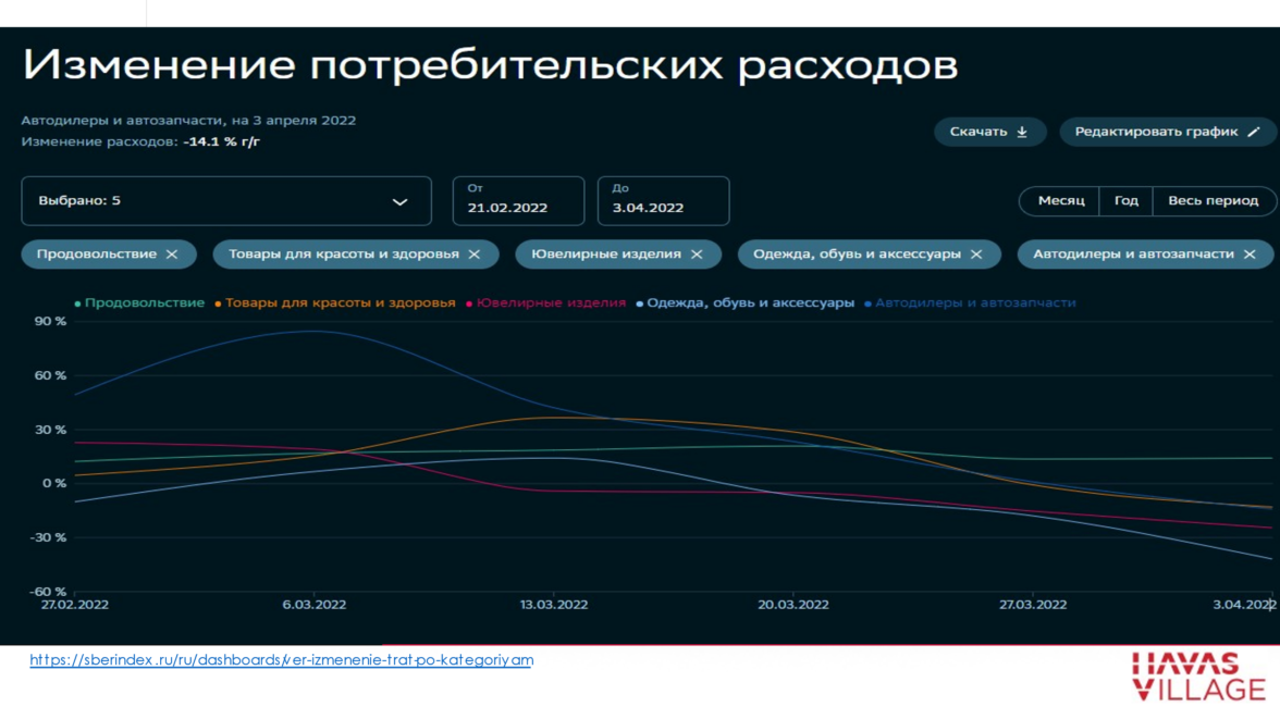 Вместе с тем, по данным SberIndex, за последнюю неделю можно наблюдать новую динамику потребительских расходов у населения. На 13 неделе темпы закупки продуктов питания вышли на уровень начала февраля, а непродовольственные категории вышли в отрицательные значения по сравнению с 2021 годом.