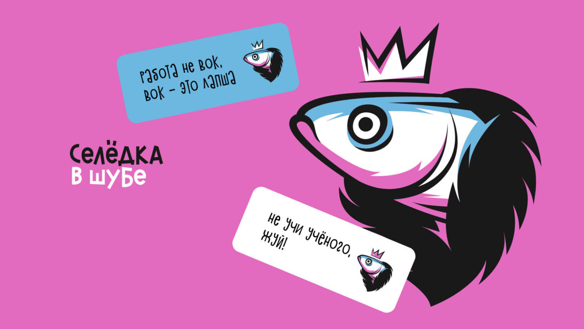 Логотип состоит из знака и шрифтовой части. В знак поместили саму селёдку: её нарядили в шубу и водрузили на неё корону. Для шрифтовой части, чтобы передать уникальность проекта, использовали леттеринг.