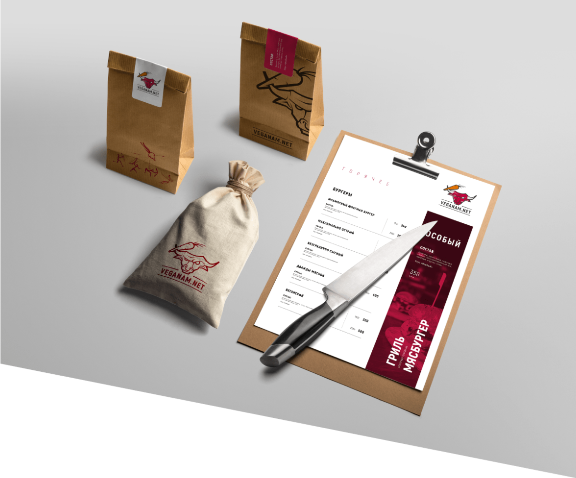 Объекты логотипа подчеркивают ориентацию компании на мясную кухню. Война быка и морковки символически отражают борьбу мнений: вегетарианцы и мясоеды не могут сойтись в том, что и почему должен есть человек. По сюжету знака аргументы последних оказались сильнее, персонаж протыкает морковку толстыми рогами насквозь, оставив ту висеть как победный трофей. Прямой и уверенный вгляд говорит всем клиентам Veganam.net: «Мы уверены в своих флагманских мясных позициях, если вы с нами, добро пожаловать».