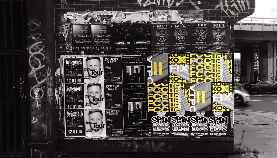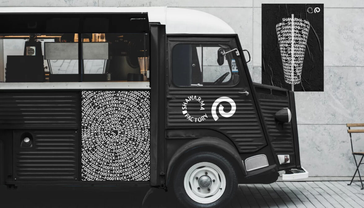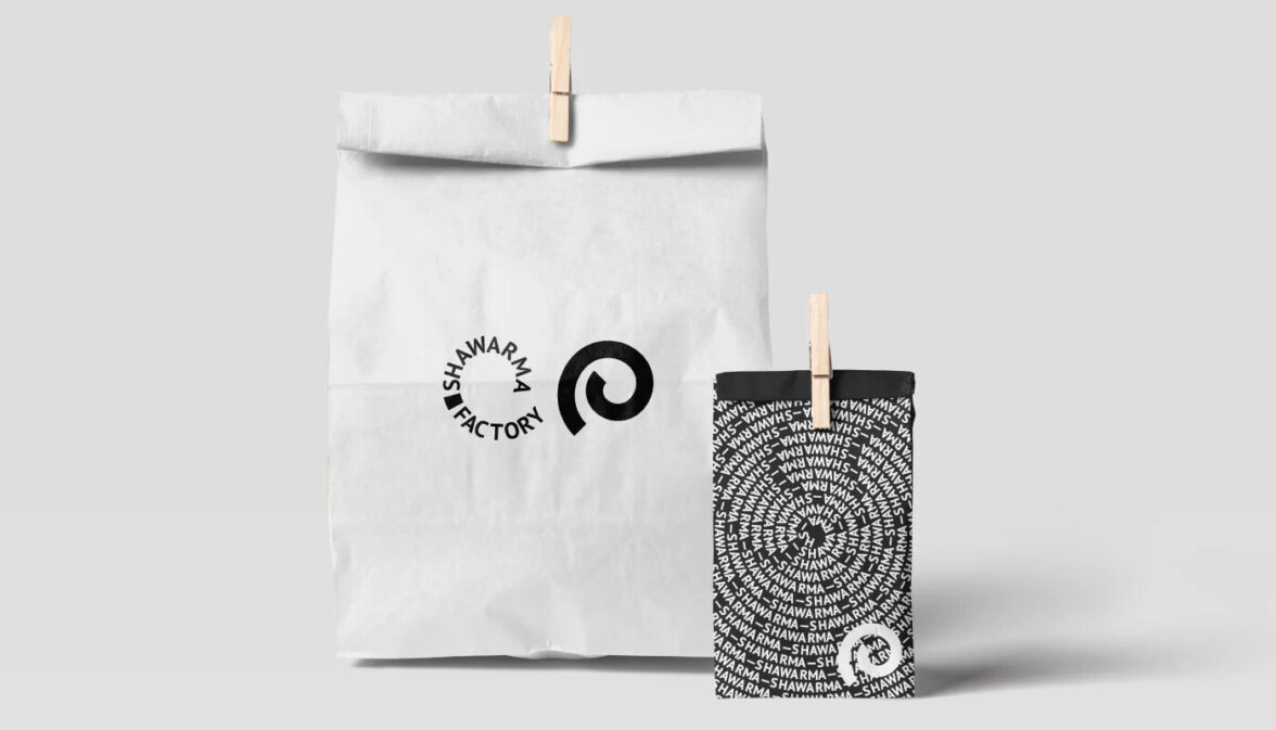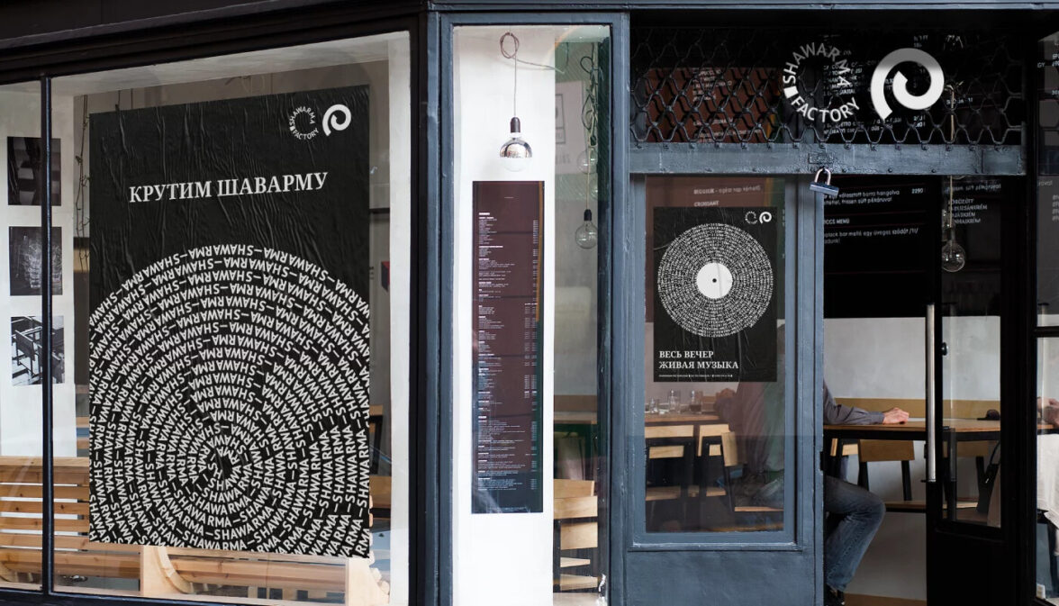 Постеры и упаковки продуктов также носят «спиральный» дизайн, объединяющий все элементы айдентики. Дизайнеры отказались от традиционных плакатов с фотографиями еды, заменив их на символы бренда: столы, бутылки, музыкальные пластинки, машины и меню украшены круговой надписью Shawarma Factory.