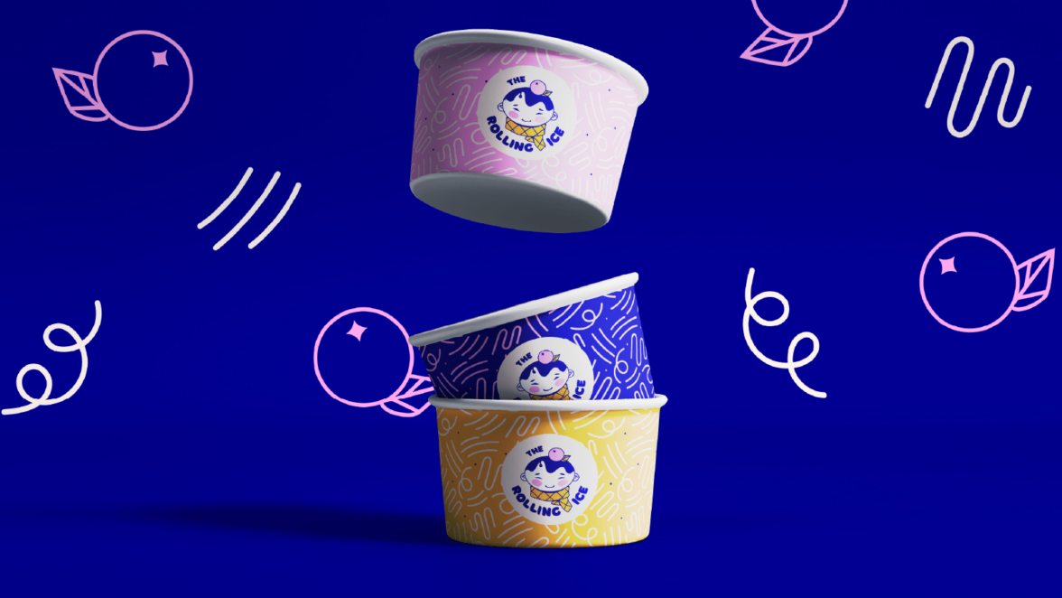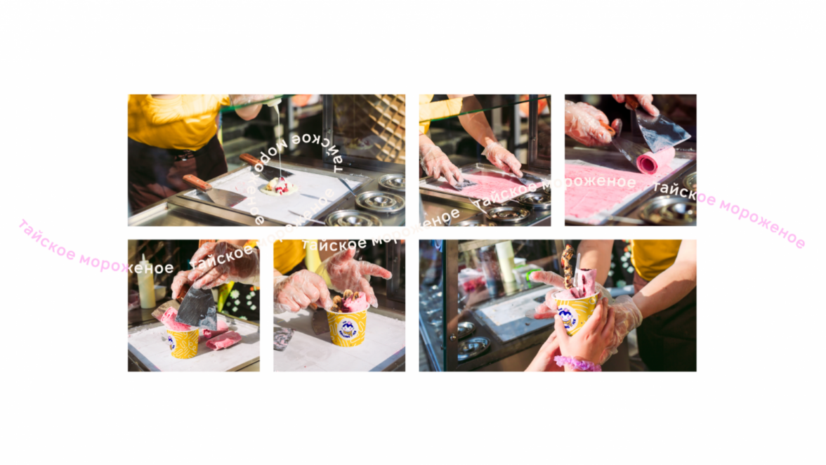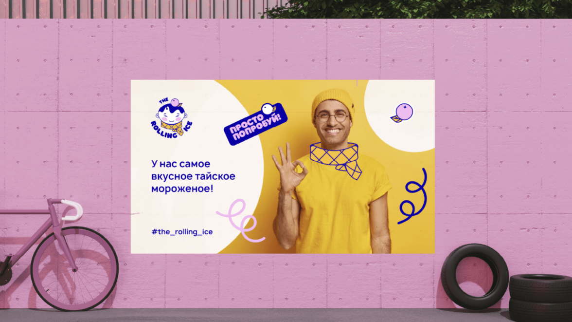 В качестве фирменных цветов дизайнеры выбрали сочетание холодного розового и насыщенного синего, вместе они напоминают ледяное мороженое. Для контраста был добавлен желтый, который вызывает ассоциации с палящим жарким тайским солнцем и вкусной хрустящей вафлей.