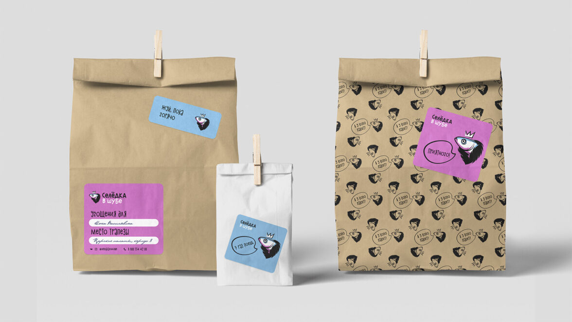 Обязательным элементом пакетов и коробок под блюда у «Селёдки в шубе» стали стикеры: их, как и планировали основатели проекта, хочется сначала сфотографировать, а затем и просто переклеить — с упаковки на ноутбук.