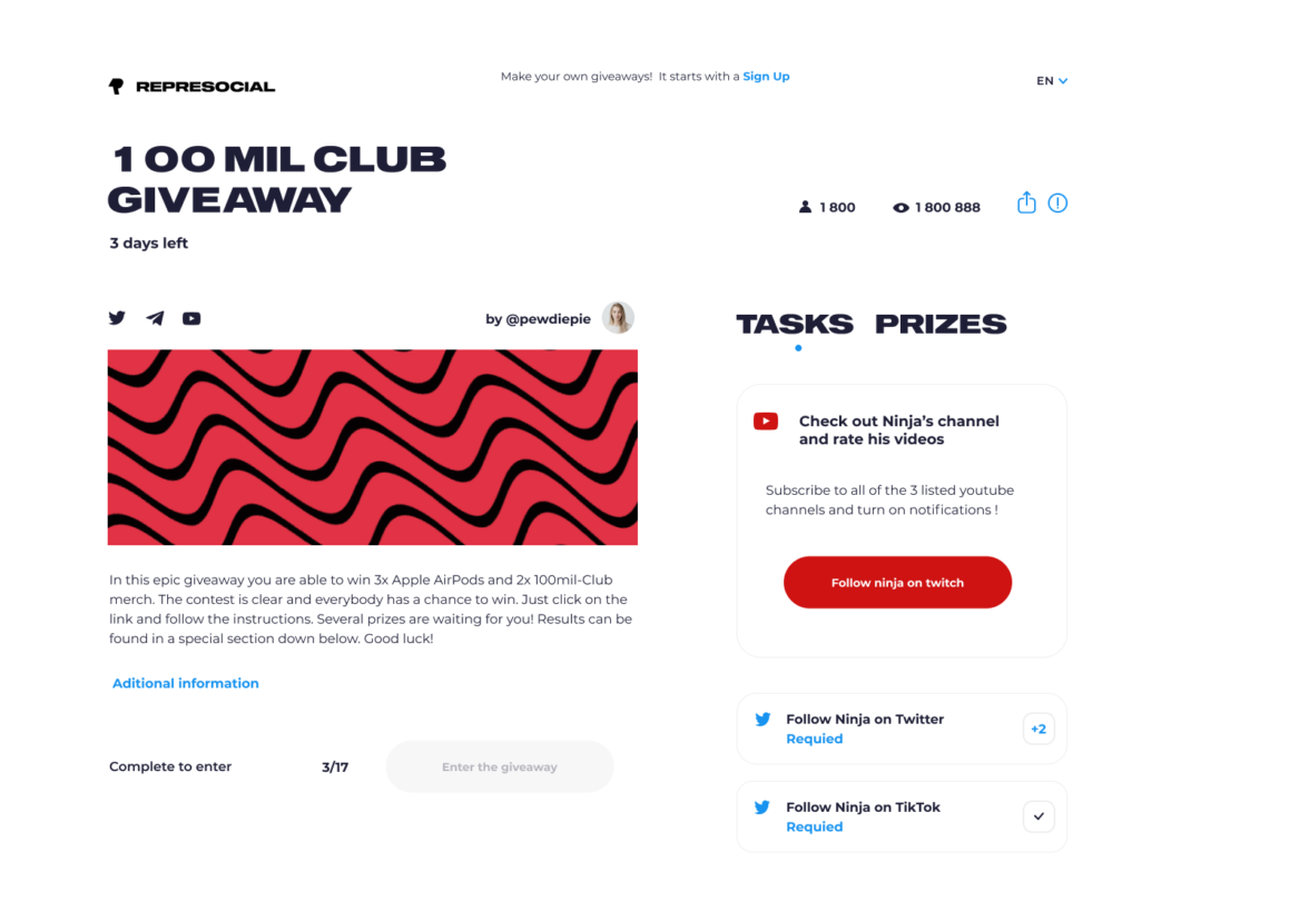 Represocial — стартап из Германии, который обратился к нам с идеей проекта и набросками дизайна в Adobe XD. Сервис поможет создать и провести giveaway, а также сохранит результаты и статистику. Например, в нем можно сделать форму участия и выбрать победителя.
