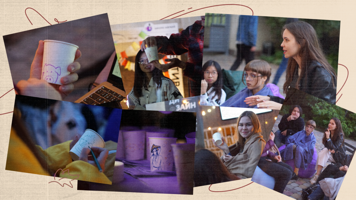 После квиза у ребят появилась возможность поучаствовать в практике от нашего графического дизайнера Анастасии Дёминой. Она предложила всем желающим сделать иллюстрации на стаканчиках. Но сначала немного теории в ламповой атмосфере, которую помогла создать гирлянда и кресла.