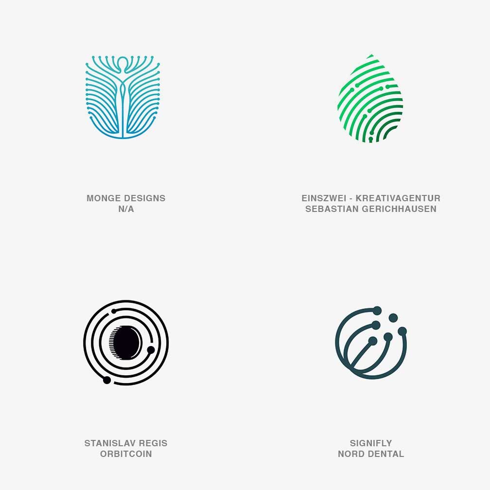 Сравнительный масштаб элементов подсказывает, должны ли мы сосредоточиться на точке как на предмете или на линии как на действии. Давайте рассмотрим варианты логотипов с трендом в окончании линий: