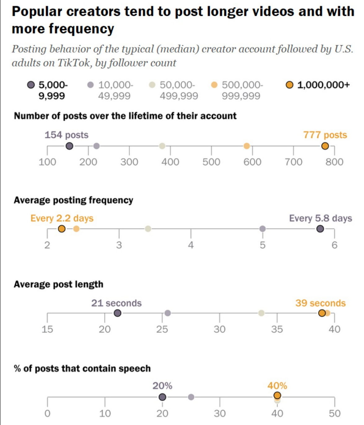 Хронометраж одного ролика авторов-лидеров в среднем составляет 39 секунд, у их менее успешных коллег — 21 секунду или менее. При этом 4 из 10 роликов авторов-миллионников содержат речь. Догоняющие сопровождают свои посты голосовыми комментариями в два раза реже.