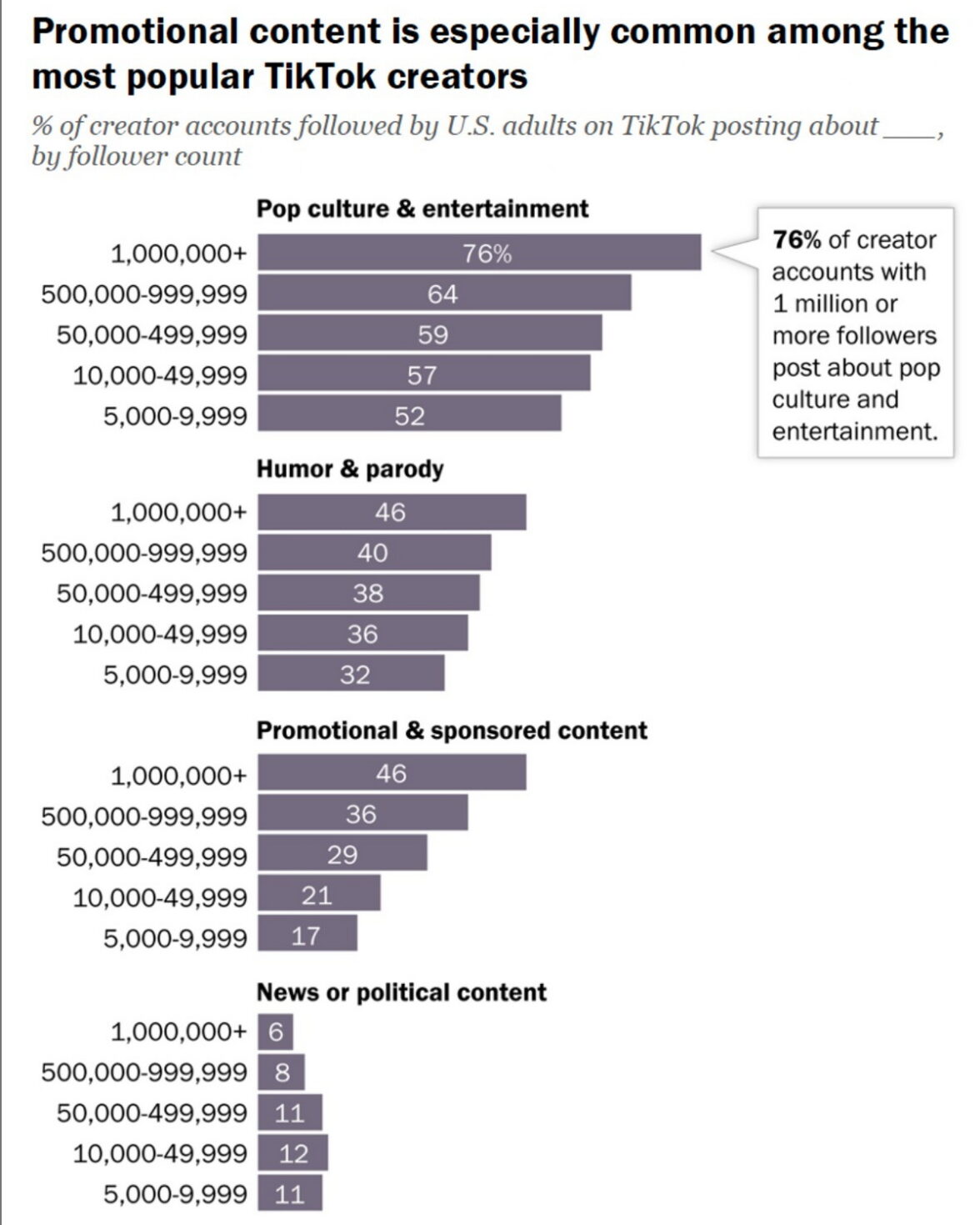 Что же касается спонсорского и рекламного контента, то тут все зависит от подписной базы. Чем больше охват, тем чаще в автор публикует какое-то промо. Платные рекомендательные посты публикуют 46% тиктокеров-миллионников.
