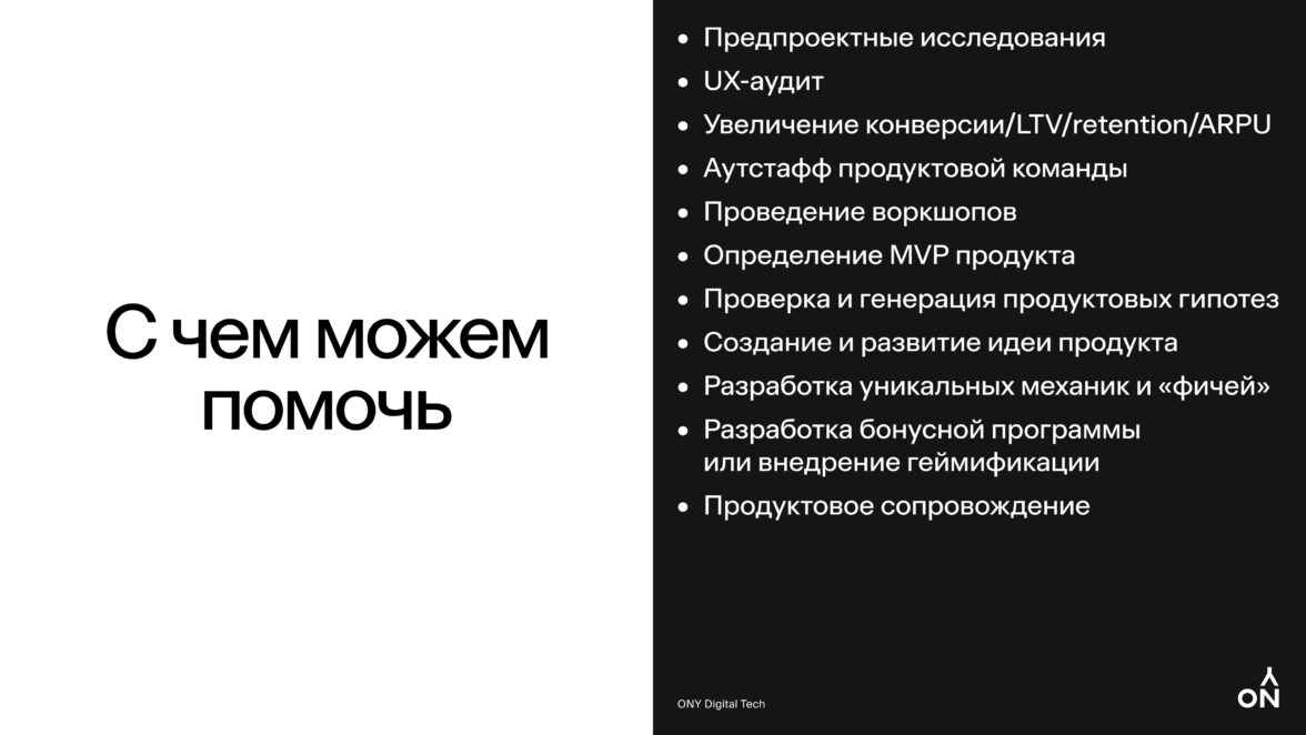 Продакт-менеджер в агентстве — это не просто редкость, а конкурентное преимущество. У нашего CPO есть опыт успешного запуска проектов в сферах fashion, fintech, healthcare, education, technology и retail. Практика показала, что его работа напрямую влияет на пользу, которую мы приносим клиентам и на успешность наших проектов. Мы в ONY предлагаем комплексный, ориентированный на результат подход: берём на себя проверку гипотез, расчёт бюджета и сроков, глубокое исследование рынка и аудит продукта. При этом клиент оплачивает только конкретные решённые задачи, а не ежемесячное содержание команды, снижая финансовые риски и повышая ROI. Такой формат подходит как для старта новых проектов с нуля, так и для оптимизации и роста существующих продуктов, обеспечивая прозрачность и гарантированные результаты.