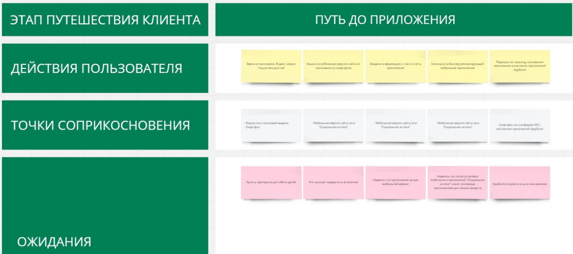 Рассмотрим основные этапы создания CJM на примере разработки мобильного приложения для аптечной сети. Использование этого инструмента при старте разработки помогло лучше понять потребности и поведение пользователей и создать приложение, которое будет максимально удобным и функциональным для них.