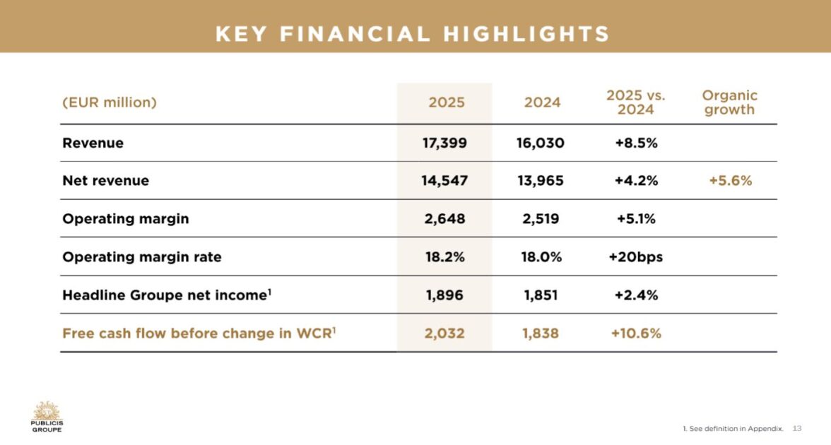 Publicis Groupe, пока формально крупнейшая в мире рекламная группа, до объявления результатов за 2025 год объединившимися американскими Omnicom и Interpublic Group (IPG), завершила прошлый финансовый год на хорошей ноте. Выручка компании выросла на 8,5% до €17,4 млрд ($20,5 млрд). Органическая выручка увеличилась на 5,6% до €14,5 млрд ($17 млрд), чистая прибыль подросла на 2,4% до €1,9 млрд ($2,2 млрд).