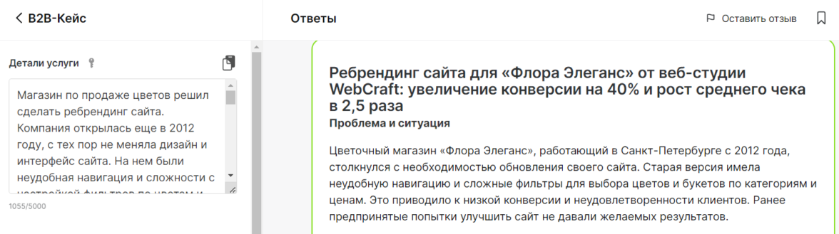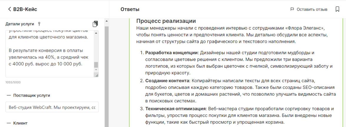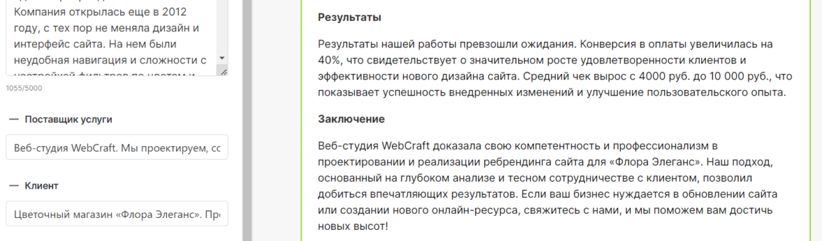 В результатах сотрудничества ИИ приводит сравнение «до» и «после», делая упор на факты и цифры. В заключении кейса нейронка подчеркивает конкурентные преимущества поставщика услуги с призывом к действию.