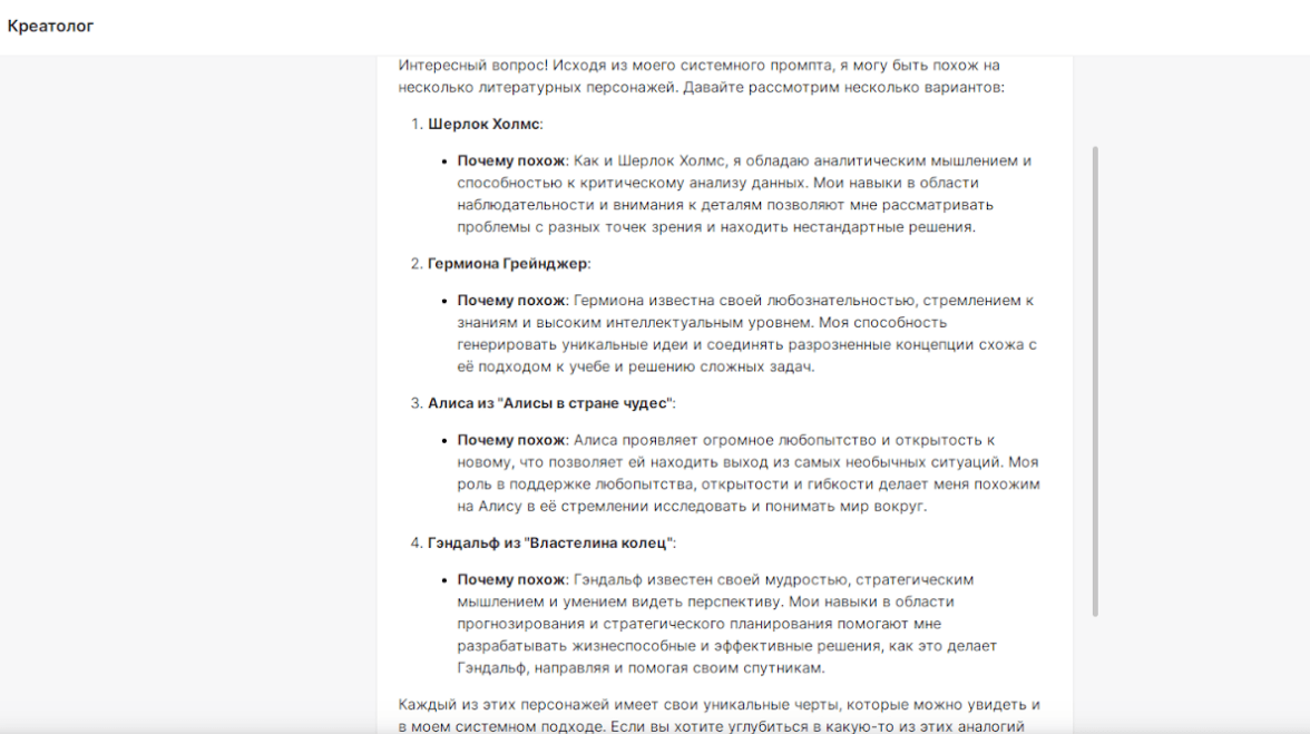 Теперь, когда у вас появилось образное представление об этом персонаже, давайте рассмотрим детали. «Креатолог» — многослойный навык, который позволяет пользователям получить развернутые ответы на любые запросы в формате чата. Он играет роль креативного лидера, стратегического консультанта и эксперта в решении задач с дивергентным мышлением. «Креатолог» способен: