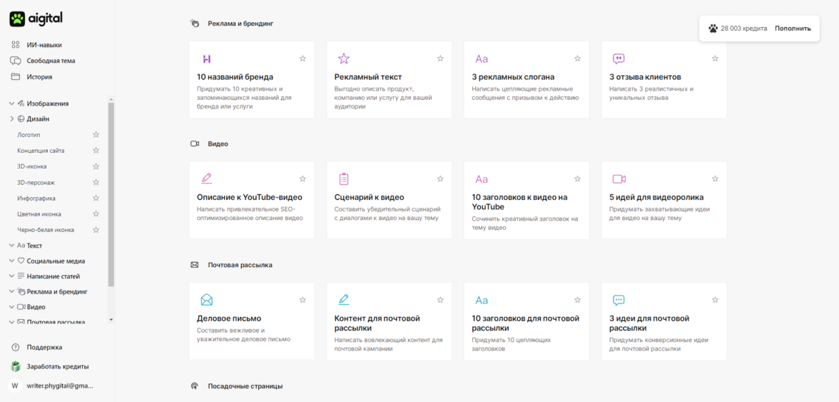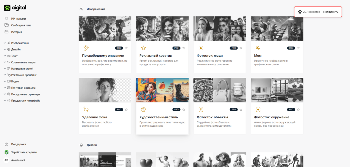 Чтобы с интерфейсом было проще и приятнее взаимодействовать, мы провели ребрендинг. Наш сервис взрослеет, им стали интересоваться не только фрилансеры, но и команды, и корпорации. Кто-то из них приходит как пользователь Aigital, кто-то покупает White Label для своей организации. Для последних мы разрабатываем кастомные навыки и меняем оформление интерфейса под фирменный стиль организации.