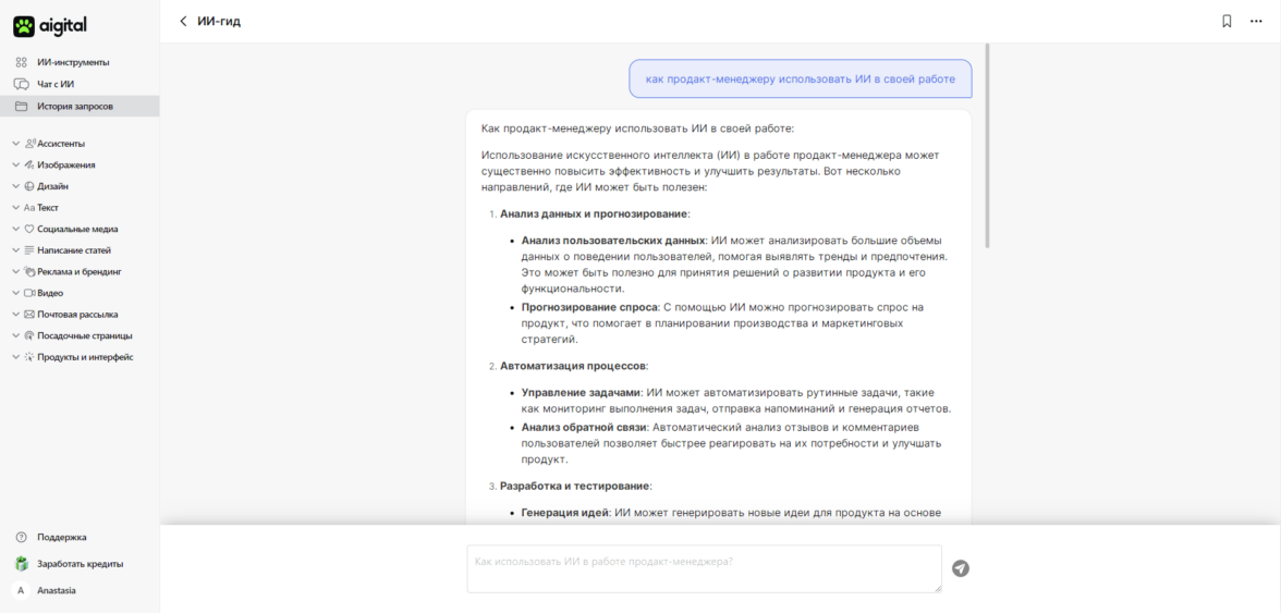 Когда мы выпустили первых ИИ-ассистентов, увидели, что нам не хватает главного — помощника в работе с нейросетями и с нашим сервисом. Мы назвали его ИИ-гид и запрограммировали помогать пользователям писать промпты. Но в процессе разработки поняли, что он также может подсказывать пользователям, как решать задачи с помощью Aigital.