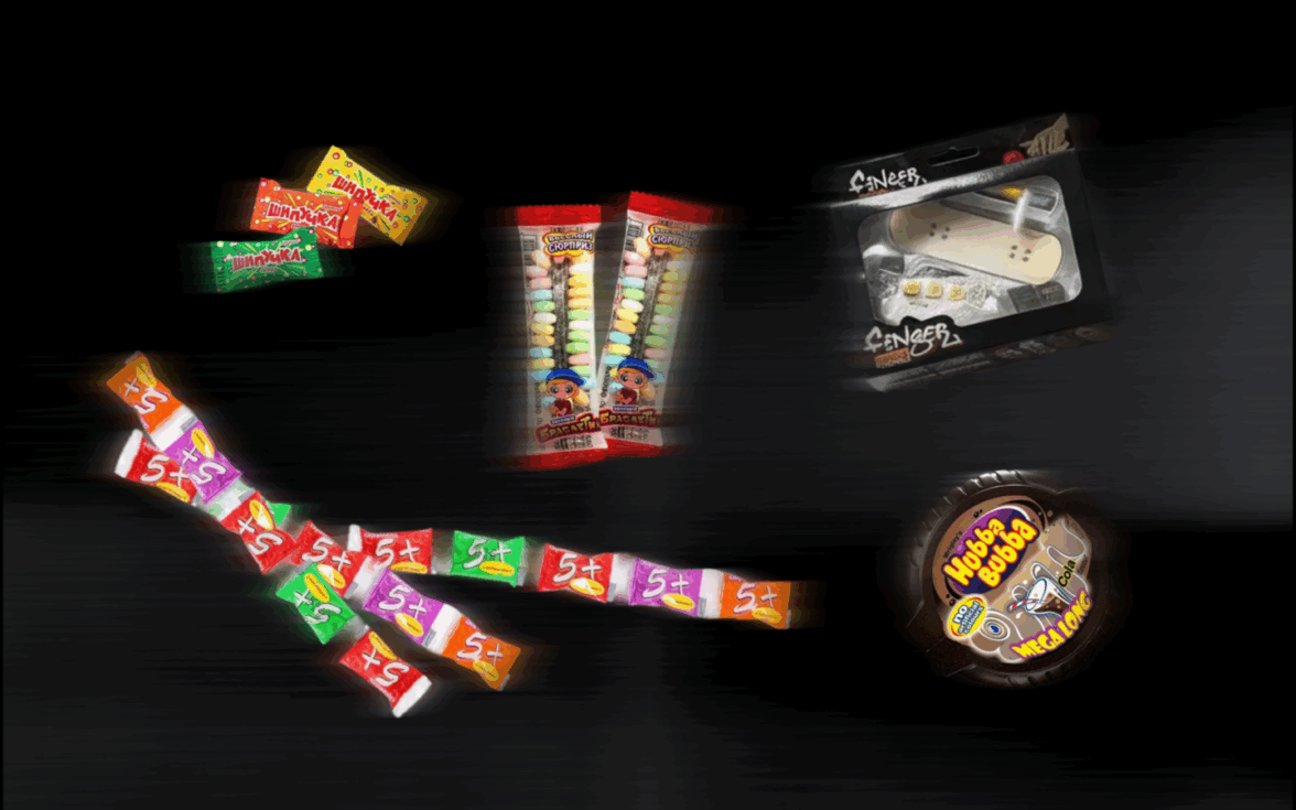 Еще внутри пака был фингерборд. Как написала админ одного из каналов — чтобы закадрить главного скейтера школы.Сладости мы подбирали, конечно, тоже из детства: жвачка Хубба Бубба, конфеты 5+, шипучки, съедобные часы-браслет, Мамба. Мы скупили её всю на Озон, но даже так нам не хватило и пришлось заменять другими конфетами.