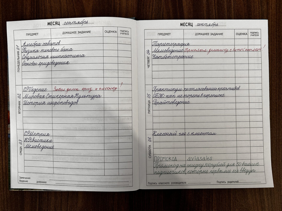 Внутри дневника мы заполнили расписание на первую неделю. Название школьных предметов поменяли на термины из маркетинга, чтобы они подходили под реальную жизнь админов телеграм-каналов. Получились, например, такие: Мемоведение, История инфоповодов, Алгебра охватов.Красной ручкой написали замечания: «Прислал домашку с битой ссылкой» или «Громко смеялся над бюджетом на клиентском созвоне».
