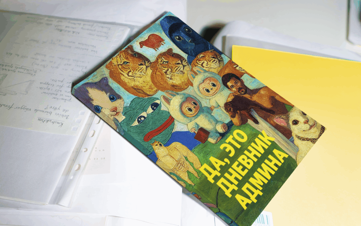 Для подписи на обложке использовали отсылку к прошлому рекламному слогану Яндекс Маркета «ДА, ЭТО МАРКЕТ» и получилось — «ДА, ЭТО ДНЕВНИК АДМИНА». Кстати, дизайн мешка для сменки, в который мы все сложили, обыграли так же: «ДА, ЭТО МЕШОК ДЛЯ СМЕНКИ».