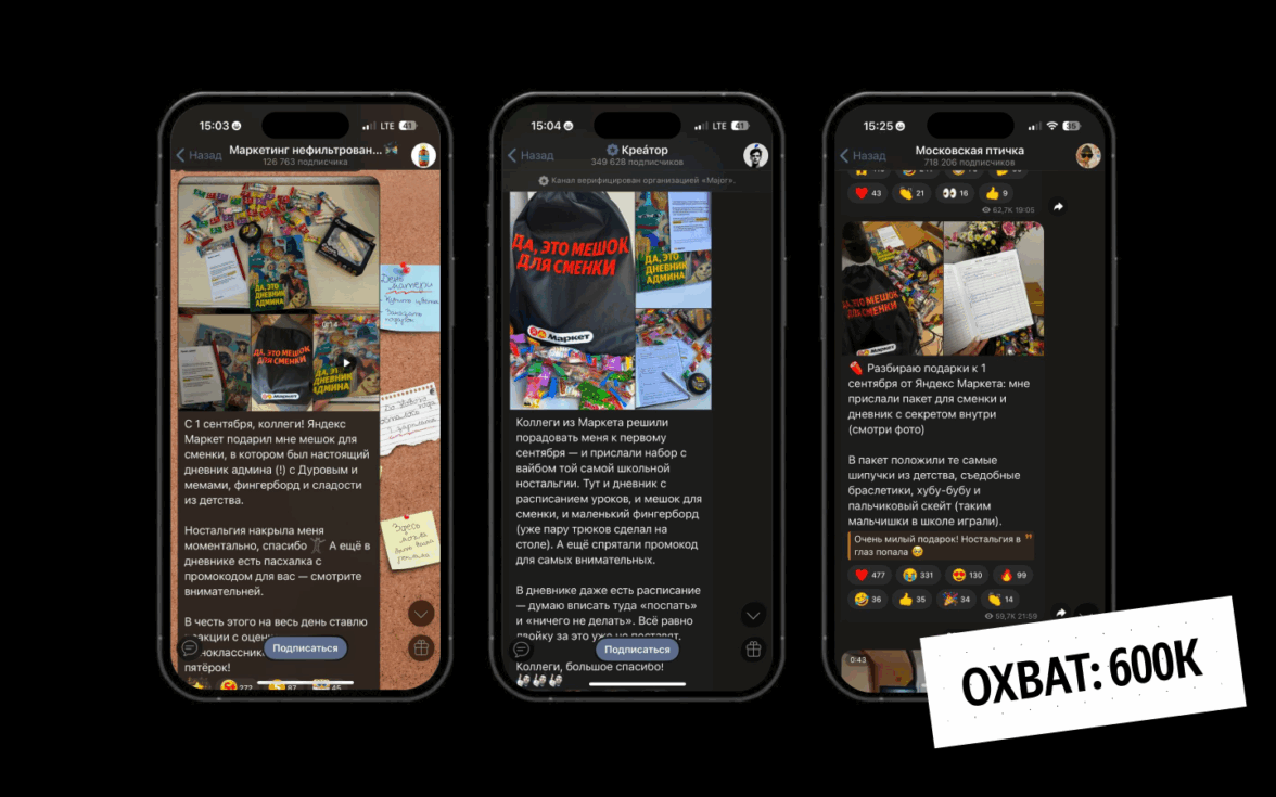 В августе к нам обратился Яндекс Маркет с таким запросом: они хотели креативно поздравить дружественных админов крупных телеграм-каналов и бренды с началом учебного года — и попросили нас придумать, как это лучше обыграть. Клиент планировал создать классную блогерскую рассылку и напомнить о себе, так что мы сосредоточились на охватах как на основной метрике.